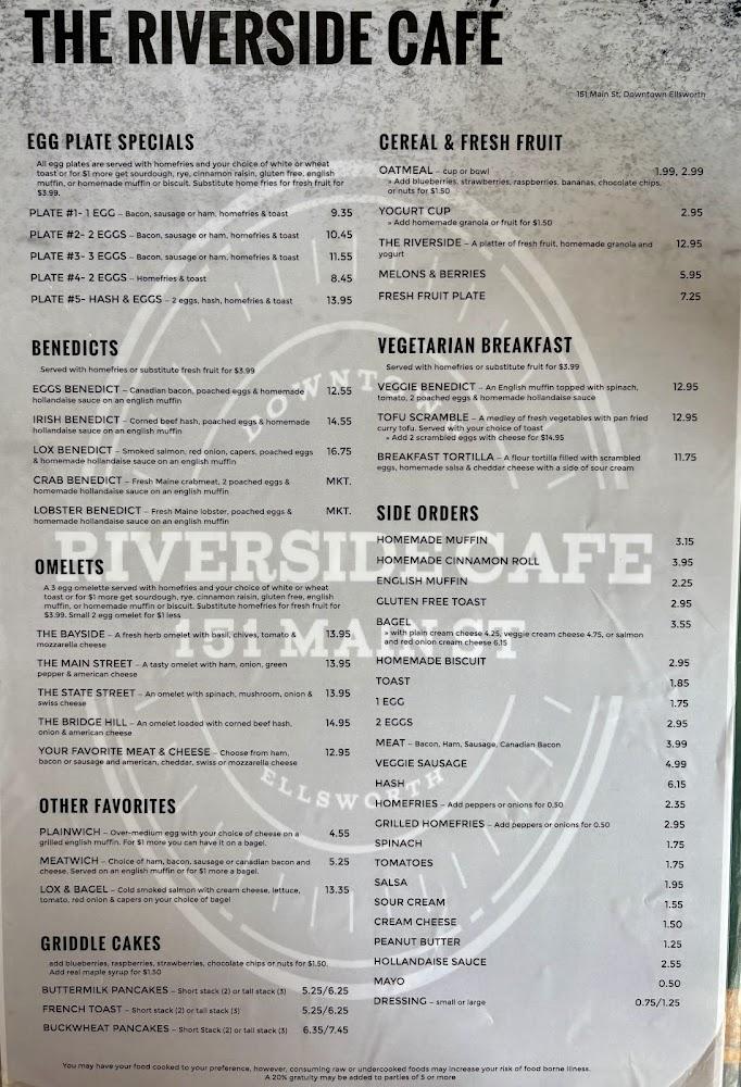 Welcome to Cafe Riverside, your go-to spot in Ellsworth for a delightful brunch experience! Nestled at 151 W Main St, our cozy cafe offers a warm and inviting atmosphere perfect for families, groups, and solo diners alike. Enjoy a menu featuring excellent coffee, delectable desserts, and a wide selection of teas, all while savoring local specialties. With options for breakfast, lunch, and everything in between, plus vegetarian and vegan dishes, there’s something for everyone. Accessible and friendly, we pride ourselves on quick service and a casual ambiance. Join us for a meal you won't forget!